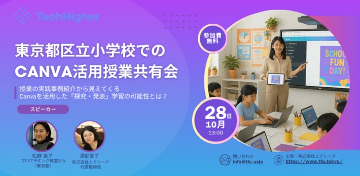 2年で200教室以上に教材を提供する『TechHigher』を運営する株式会社エクシード(本社:東京都渋谷区、代表取締役:澤部愛子)は、Canvaを活用した小学校での出張授業事例を紹介するオンライン勉強会を開催します。