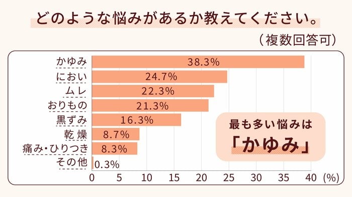 デリケートゾーンの具体的な悩みとして最も多い回答を得たのは、“かゆみ”で300人のうち約38%でした。
