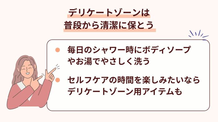日常的に正しくデリケートゾーンを洗えていれば、清潔さは十分にキープできます。よりセルフケアの時間を楽しみたい、外出時にもデリケートゾーンをケアしたいと考えるのならば、デリケートゾーン用のアイテムを使うのもよいでしょう。