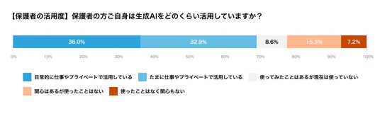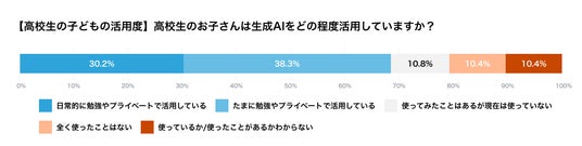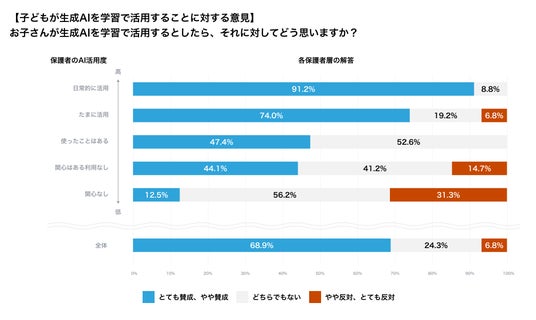 - 調査では、高校生の保護者の 69% が生成AIを「日常的に」または「たまに」利用していると回答した。子どもの利用状況についても同じく 69% が「日常的に」または「たまに」使用していると答えている。- 子どもが学習で生成AIを使うことについては、保護者全体の 69% が「賛成」または「やや賛成」と回答。保護者自身の利用度が高いほど、子どもの利用にも前向きである傾向が見られ、自分が「日常的に使う」と答えた保護者の 91% が賛成し、「たまに使う」と答えた保護者でも 74% が賛成している。
