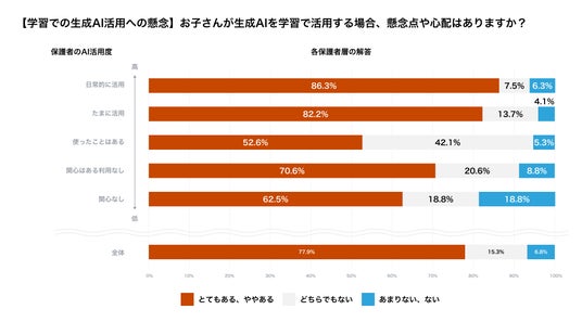 - 懸念も見られた。全体の 77% の保護者が生成AIを使うことに対しての懸念が「とてもある」「ややある」と回答しており、特に「日常的に使う」と答えた保護者では 86% が懸念を持っていた。