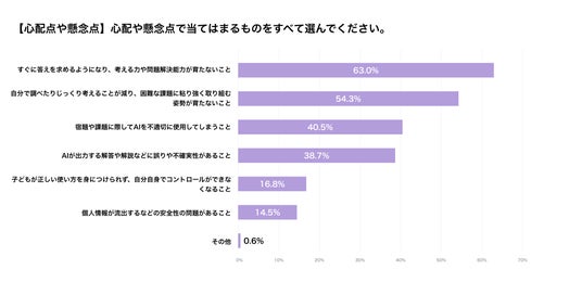 - 懸念内容として最も多かったのは、「すぐに答えを求めるようになり、考える力や問題解決力が育たなくなる」(63%)「自分で調べたり考えたりする機会が減り、困難な課題に粘り強く取り組む姿勢が育たない」(54%)といった学習姿勢への影響であった。