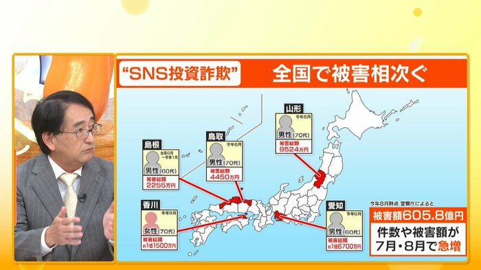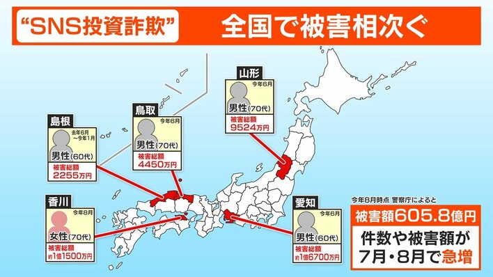 警察庁によると、7月ごろから増え始め8月末の時点で今年(2025年)の認知件数は4700件以上、被害額は605億円以上となっています。