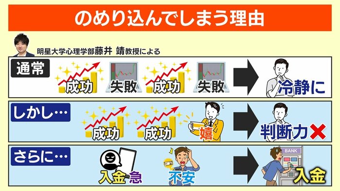 明星大学心理学部の藤井靖教授によると、通常、投資などが連続で成功することはなく、一度失敗したところで冷静になり、落ち着いて判断できるようになりますが、連続でお金が増えているように見えると、感情が歓喜している状態が続き、冷静な判断ができなくなってしまうそうです。