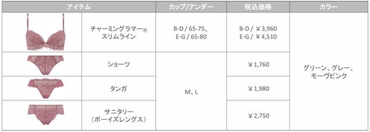 ブラジャーは、谷間ふっくら&スリムなシルエットを叶える「チャーミングラマー(R) スリムライン」。ショーツはお好みに合わせて選べる3種類をご用意しました。日常に特別な輝きを添える、しなやかでエレガントなコレクションです。