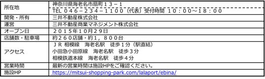 小田急小田原線、相模鉄道本線、JR相模線の3路線が乗り入れる海老名駅と連絡デッキで直結した、神奈川県央のランドマークとなる商業施設。先進的なデザインの空間に、選りすぐりのショップが約260店舗出店。空間デザイン・ショップ・イベントの複合的な組み合わせによって海老名のコミュニティの場となる施設のセントラルゾーン「EBICEN coasis(エビセン コアシス)」、昼と夜で異なる雰囲気を演出し、ディナータイムも楽しめるフードコート「EVVIVA!(エヴィーバ!)」、人気のスーパーマーケットをはじめ、多彩なラインアップで新しい食のスタイルを提案する食物販ゾーン「EBINA Food Selection(エビナ フードセレクション)」、ファッションをより楽しむためのお店として診断体験サービスを凝縮した「LaLaport CLOSET(ララポート クローゼット)海老名」に加え、ハイセンスなファッションや雑貨で上質なライフスタイルを発信する話題のショップを集結している。 2022年には開業以来初となる大型リニューアルを実施し、お客様が思い思いの時間を安心して楽しく過ごしていただける空間へと進化を続けている。