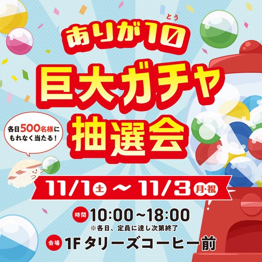 【参加条件】11月1日(土)~11月3日(月・祝)の期間中に2店舗以上で合計5,000円以上(税込/合算可)お買上げの対象キャッシュレス決済レシートを提示すると、巨大ガチャ抽選会に1回ご参加いただけます。さらに、三井ショッピングパークメンバーズプログラム プレミアムメダル会員様は、メダル画面のご提示で抽選会にもう1回参加可能!