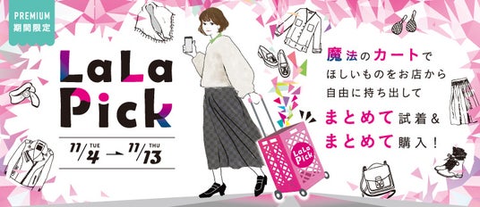 【実施概要】魔法のカートでほしいものをお店から自由に持ち出してまとめて試着&まとめて購入!ショップやブランドの垣根をこえて、気になる服をまとめて試せる新しいショッピング体験。LaLa Pickなら、ぜんぶ一緒に試して、そのまま買えちゃう!