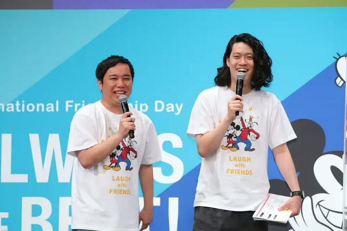 「ミッキー&フレンズ国際フレンドシップデー記念!PRイベント」が行われ、霜降り明星(せいや、粗品)とぼる塾が登場しました。