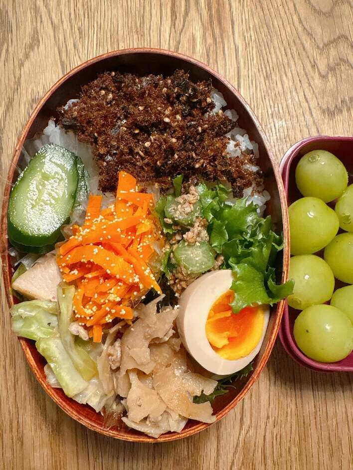 そして、きゅうりの漬物、にんじんしりしり、煮卵、野菜の炒め物など、品数豊富なおかずが、彩り豊かに詰められています。