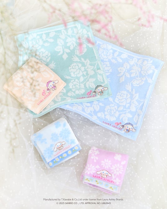 ローズモチーフデザインのタオルハンカチにはおめかしをしたシナモロールを刺繍しています。可愛らしい表情にご注目ください!