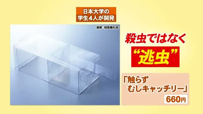 ほかにも、日本大学の学生が開発した、触ることなく虫を捕まえて外に逃がすことができる「触らずむしキャッチリー」という商品も登場。