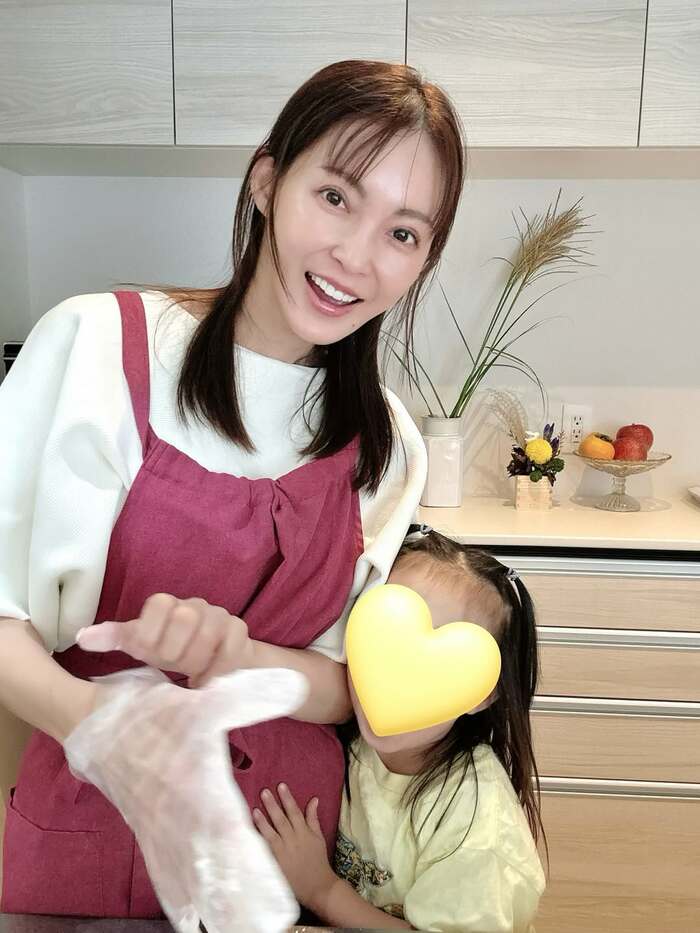 写真には赤いエプロンをつけてビニール手袋を手にはめようとする押切さんにピッタリとくっつく娘の姿が!