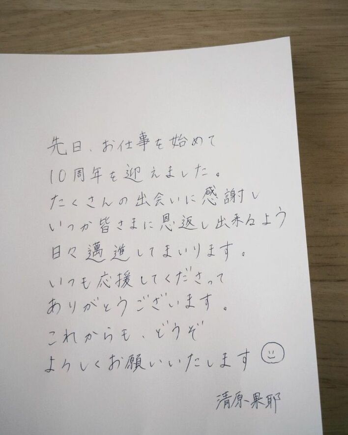 清原さんは、「先日、お仕事を始めて10周年を迎えました。たくさんの出会いに感謝しいつか皆さまに恩返し出来るよう日々邁進してまいります。