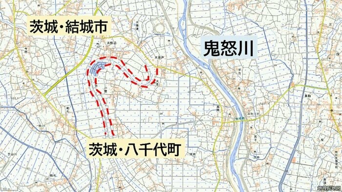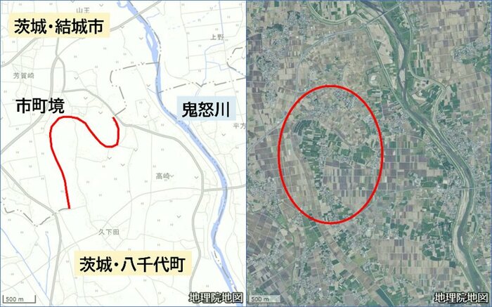 そして、これがまた興味深いんですが、当時国と国の境目だった旧河道が、いまも結城市と八千代町を分ける境目になっているんです。