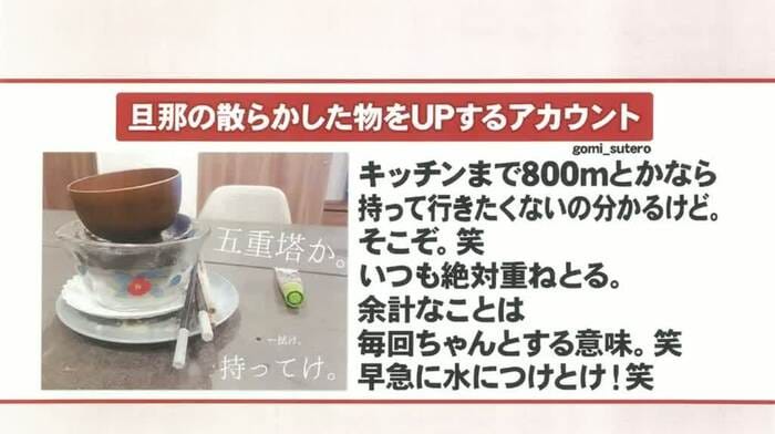 「夫婦のガサツ、どこまで許せる?」というテーマでは、夫が散らかしたものにツッコミを入れてアップしているインスタグラムのアカウントが登場した。