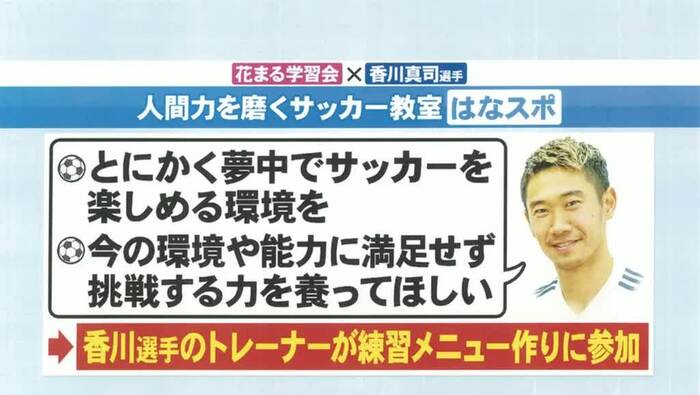 「子どもの能力の伸ばし方」に関する話題では、香川真司選手と、“メシが食える大人”を育てる学習塾「花まる学習会」がタッグを組んで設立された子ども向けサッカースクール「はなスポ」が紹介された。このスクールでは、サッカーの練習を通して判断力や考える力、分析力なども伸ばす指導法が取られているという。