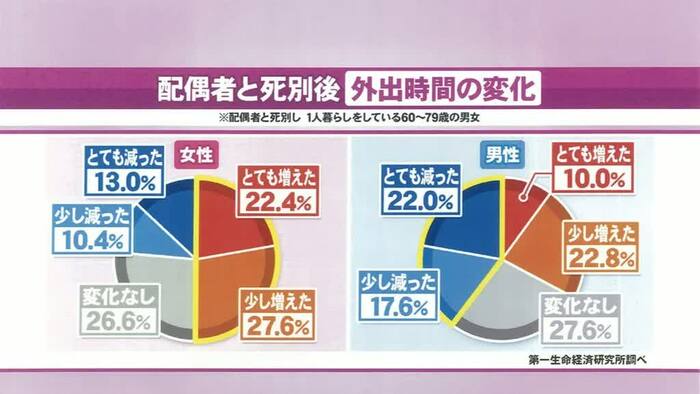 三木によると「定年後の男性は妻を通じて世間とつながっているため、妻に先立たれると何もできなくなってしまうケースが多い」そうで、竹山と金子も「男性の方が実は友達が少ない」と自身の状況を分析。実際、配偶者が亡くなった後、男性のほうが外出する時間が減るというデータも紹介された。