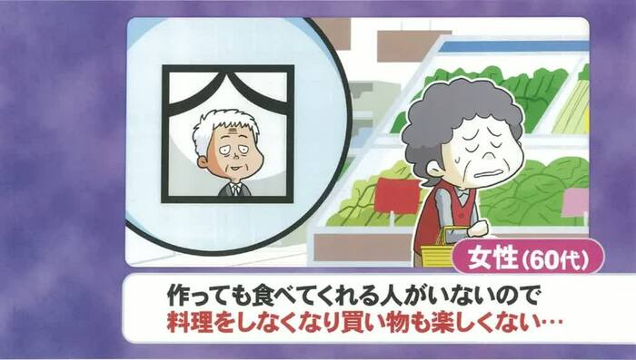 紹介されたのは、「1年半前に妻を亡くし、気持ちの整理がつかない」という60代男性や、「夫が亡くなってから、大好きな料理を作る気力がわかない」という60代女性の声だ。