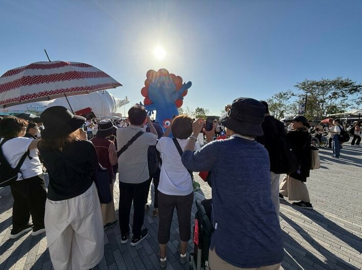 ミャクミャクの背後に多くの人…お目当ては「ミャクけつ」