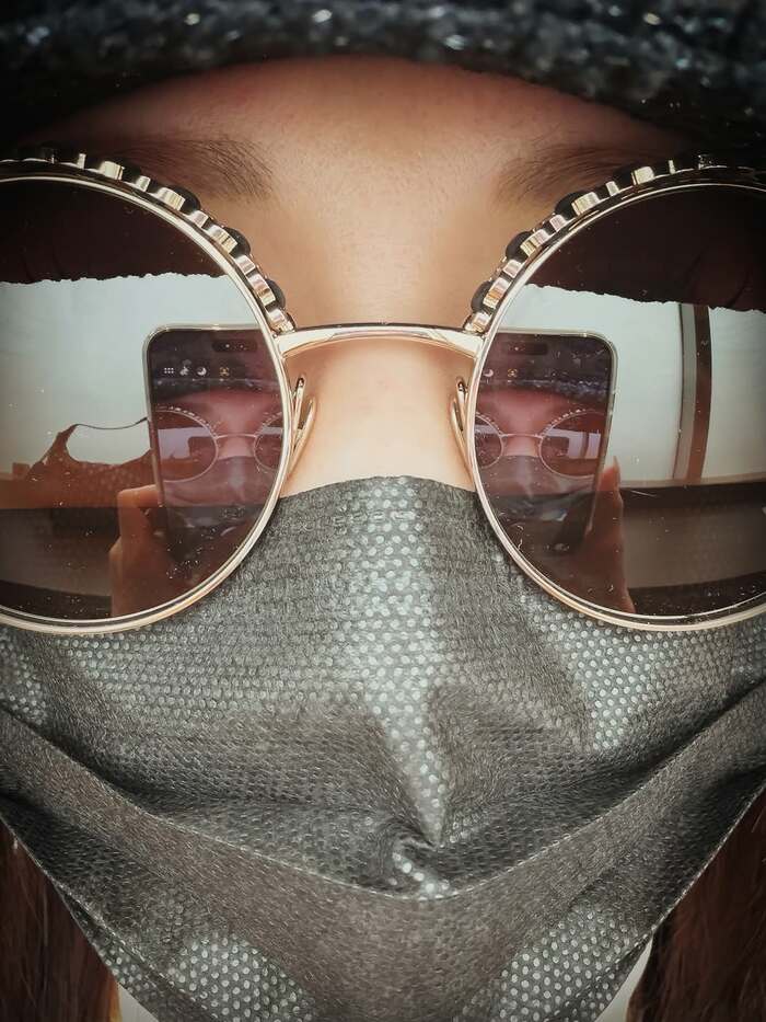 薄暗いサングラスのレンズには、スマートフォンを持った浜崎さんの手元が映っていて、そのスマートフォンの画面にも「虫みたいやろ」という自身の姿が。