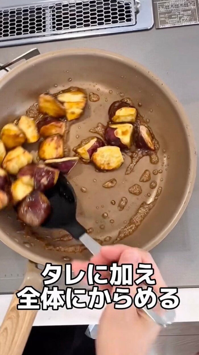 タレにさつまいもを戻し入れ全体に絡めたら火を止めて黒ごまを振り、ざっと混ぜて完成です!