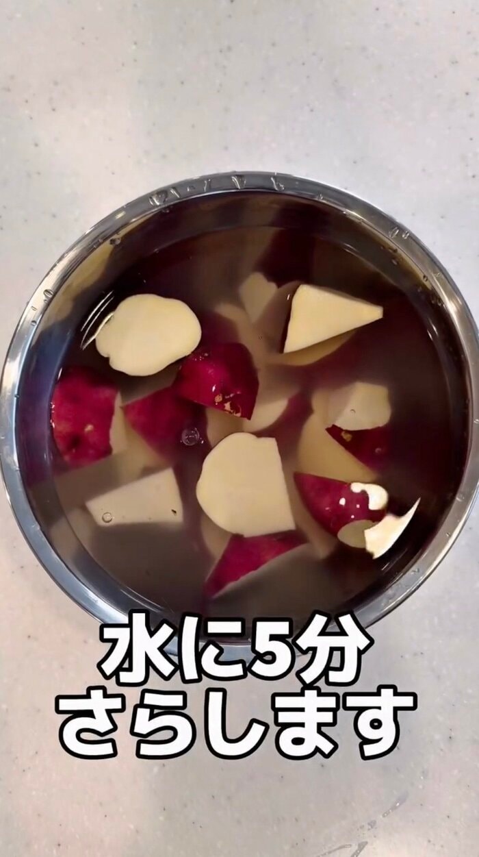 「さつまいもは皮つきのままよく洗い、乱切りにします。水に5分ほどさらしてでんぷんを抜き、水気を拭き取ります。」と、小倉さんは動画だけでなく文章でもわかりやすく説明していきます。