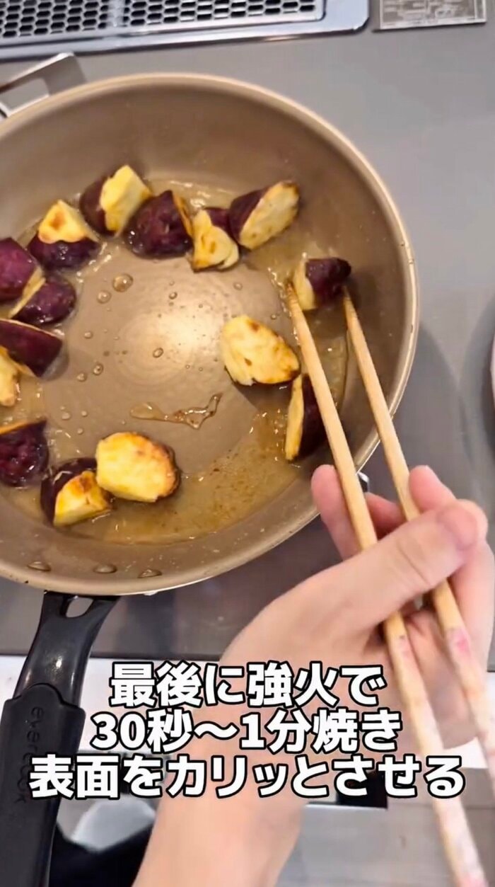 今回の分量では「600Wで3分」と紹介した小倉さん。これである程度さつまいもに火が入ったら、続いては大学芋の“カリッ”と食感をつけていきます。