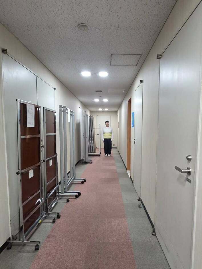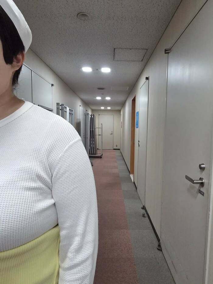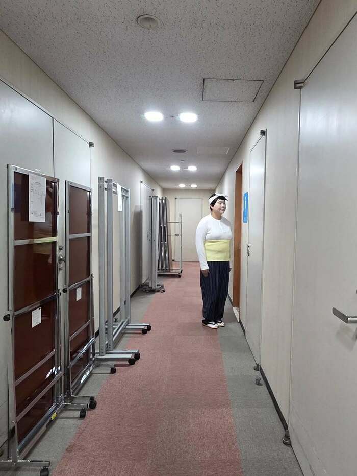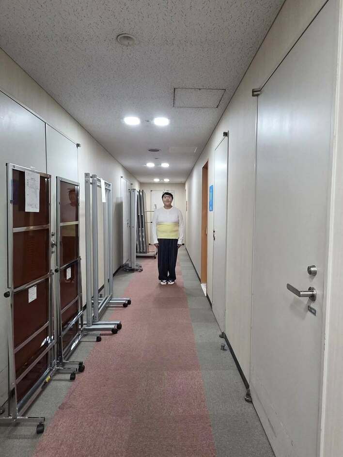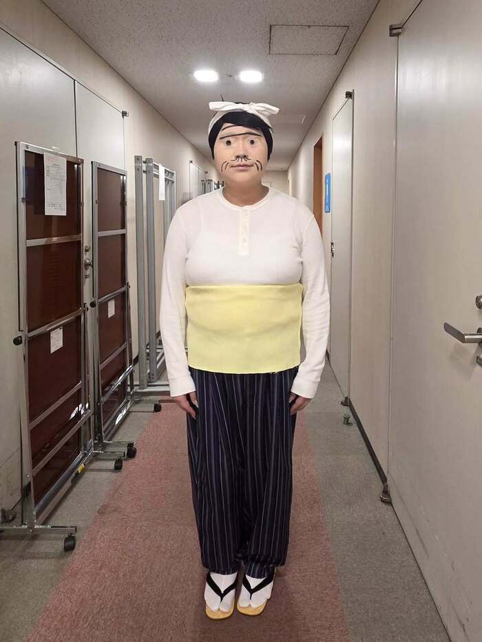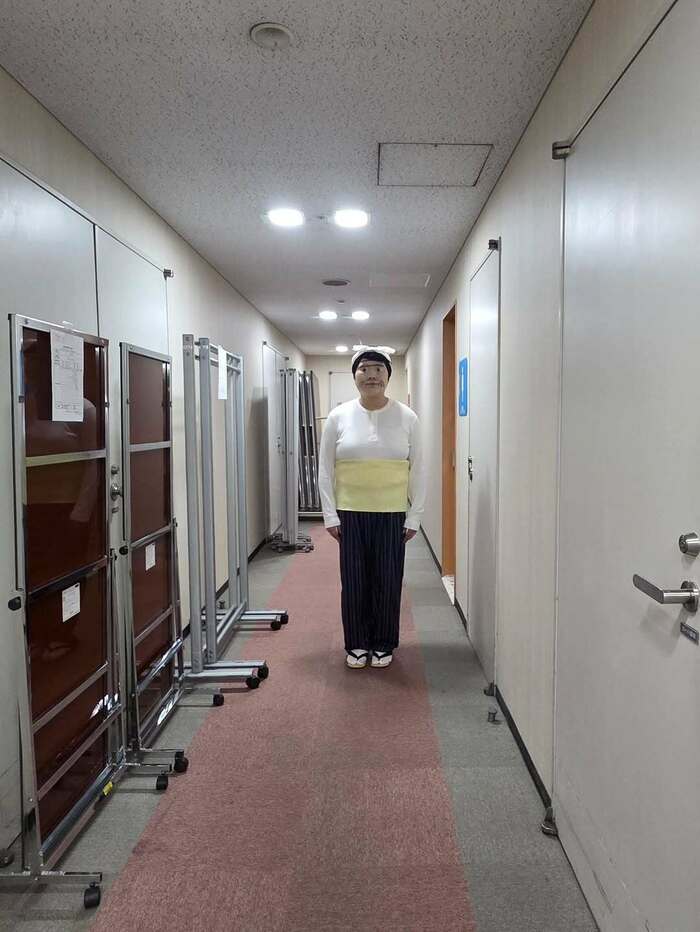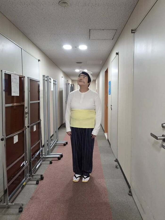 白いトップスに黒いパンツ、おなかには黄色い腹巻きをした「バカボンのパパ」のコスプレ姿で、細長い廊下の奥でスッとたたずみ、こちらをじっと見つめています。