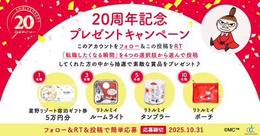 『女の転職type』公式Xアカウント(@wtypejp)をフォロー&プレゼントキャンペーンのツイートをRT&「転職したくなる瞬間」を選んで投稿した方の中から抽選で、星野リゾート宿泊ギフト券やリトルミイのグッズなど素敵な賞品をプレゼントします。