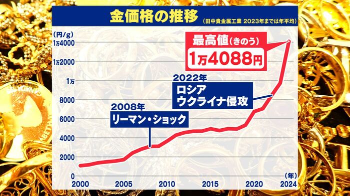 金の価格は大きく変わっているんですよね。推移を見ると、年々金が上昇している状況で、世界の情勢が不安定になってくると安全な資産と言われている金の需要が高まるということなんですよね。きのうは最高値1万4088円を付けました。10年前と比べると、約3倍くらいになっていますね。