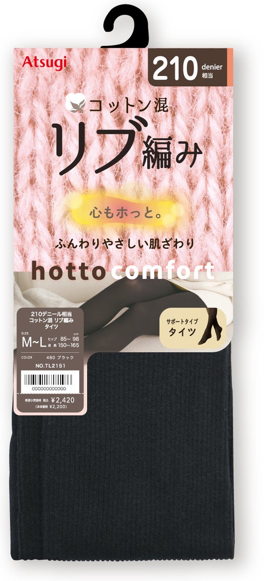 コットン混リブ調タイツ(210デニール相当)210デニール相当の1×1の細リブタイツ。コットン混仕様のため、あたたかくてやさしい肌触りです。パンティ部はフィット感がアップする立体編み仕上げです。足底メッシュ仕様、お腹押え機能付き。後ろマチ付きで動きやすい仕様です。同じ生地で10分丈レギンスも展開しています。(画像はタイツです。)
