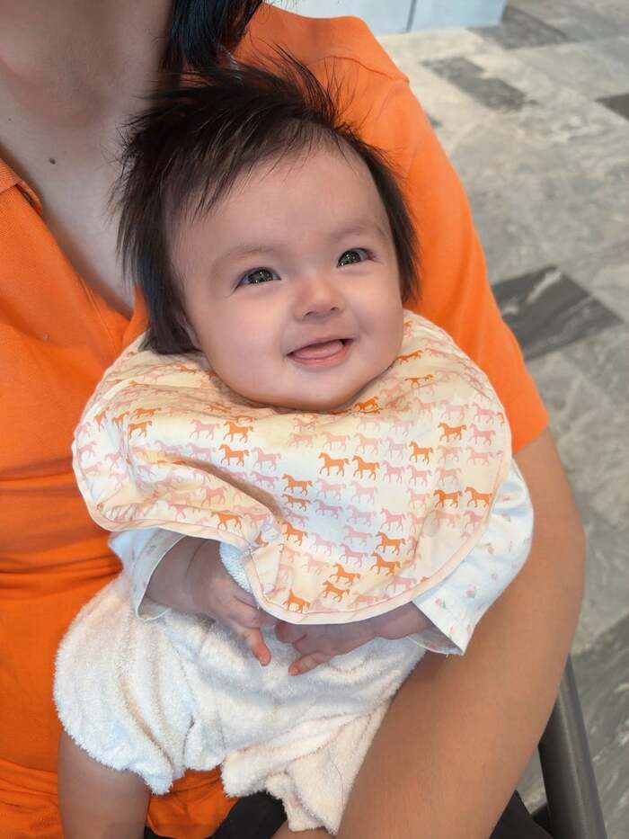 そして、お姉ちゃんが使っていたスタイをつけて、とてもうれしそうな笑顔を浮かべる“ググガガちゃん”。こぼれ落ちそうなぷくぷくのほっぺや、くりくりのおめめがとってもかわいくて、癒されますね。