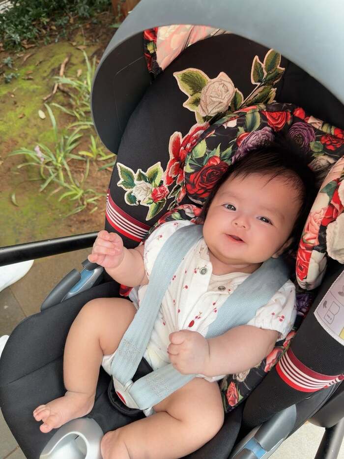 華やかな草花模様が際立つベビーカーに座って、カメラを見上げにっこり笑っている姿や・・・
