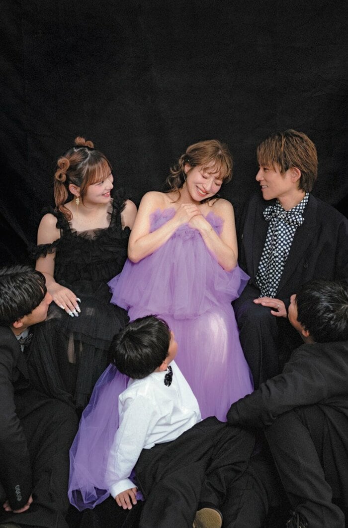 公開されたカットには、淡い紫色のフリルのドレスを着て、笑顔を浮かべる辻󠄀さんを真ん中に、家族全員で手をつないでいます。蝶ネクタイを着けた杉浦さんと同じスタイルの3人の息子たち、黒のドレス姿の長女・希空さんと、それぞれおしゃれなコーデで決めた1枚に。