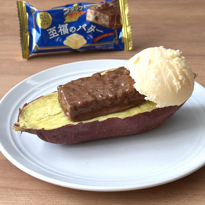 - お好みでバニラアイスを添えて完成。※焼き芋のサイズやお好みに合わせてブラックサンダー至福のバターを乗せる量を調整してください。 ブラックサンダー至福のバターがしっかり乗っている方がおすすめです。