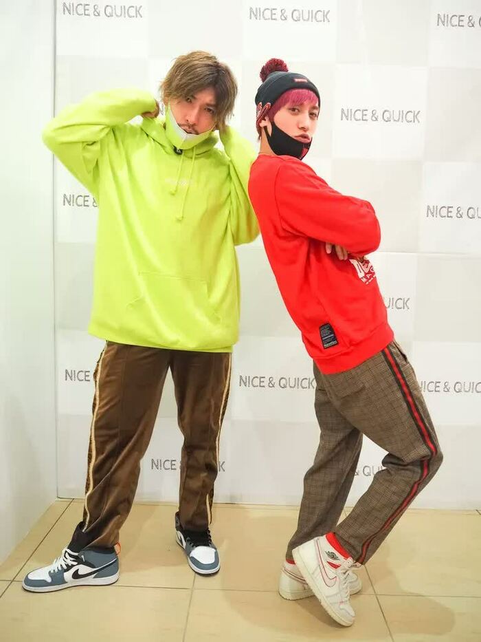 2人の衣装はとにかく「派手」。第一印象で「チャラそう!」と思わせてくれる、ポップなデザインや色使いを選ぶのがEXIT流だ。この日は共にトレーナー×パンツという着こなし。