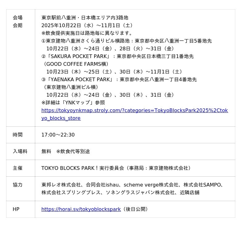 東京建物株式会社(以下「東京建物」)が事務局を務めるTOKYO BLOCKS PARK!実行委員会は、東京駅前の八重洲・日本橋エリアの3つの路地空間を活用した期間限定イベント「TOKYO BLOCKS PARK!」(以下「本イベント」)を2025年10月22日(水)から11月1日(土)まで開催します。