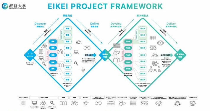 叡啓大学では、学生たちが実社会の問題に取り組む際に活用できる独自のフレームワーク「叡啓プロジェクトフレームワーク」を整備し、課題解決演習(PBL)において学んでいます。この「叡啓プロジェクトフレームワーク」は、プロジェクトの初期段階で「なぜそれに取り組むのか」「誰のために、何を、どうしたいのか」といった構造を丁寧に整理し、価値創出に向けた足場を築くための思考・対話の枠組みです。