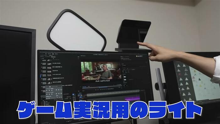 また、「ゲーム実況用にライトとか買ってるんですよ 」と、動画の編集画面が表示されたディスプレーの後ろには、四角形のライトを設置。