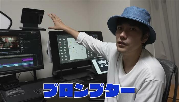 横には「WEBカメラにプロンプターっていう、こっからセリフが見える しゃべる言葉が出てくるようなことができるやつなんですよ」と、あまり聞き慣れないアイテムも。