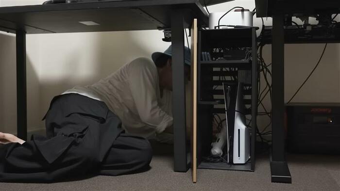 デスクの下はというと、電源の使いすぎを気にして大きめのバッテリーを1個置いているそう。