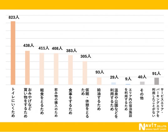サービスエリアなどを使う理由についてのアンケートを行いました。こちらも複数回答で回答いただいております。一番多かったのは「トイレに行くため」で823人と圧倒的に多く、次が「おみやげなど買い物をするため」が438人でした。