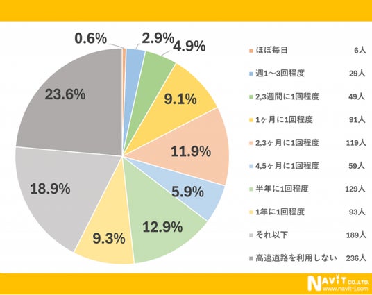高速道路を利用する頻度についてのアンケートでは「半年に1回程度」の人が一番多く12.9%という結果になりました。次に多かったのが「2,3ヶ月に1回程度」で11.9%でした。