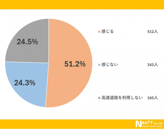高速道路を運転していて怖いと感じるかというアンケートでは「感じる」と回答された人が51.2%で「感じない」と回答した人が24.3%という結果になりました。