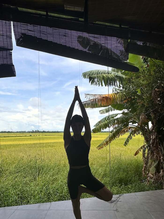 続いて、広々とした草原が見渡せる場所で、ヨガのポーズをしたショット。