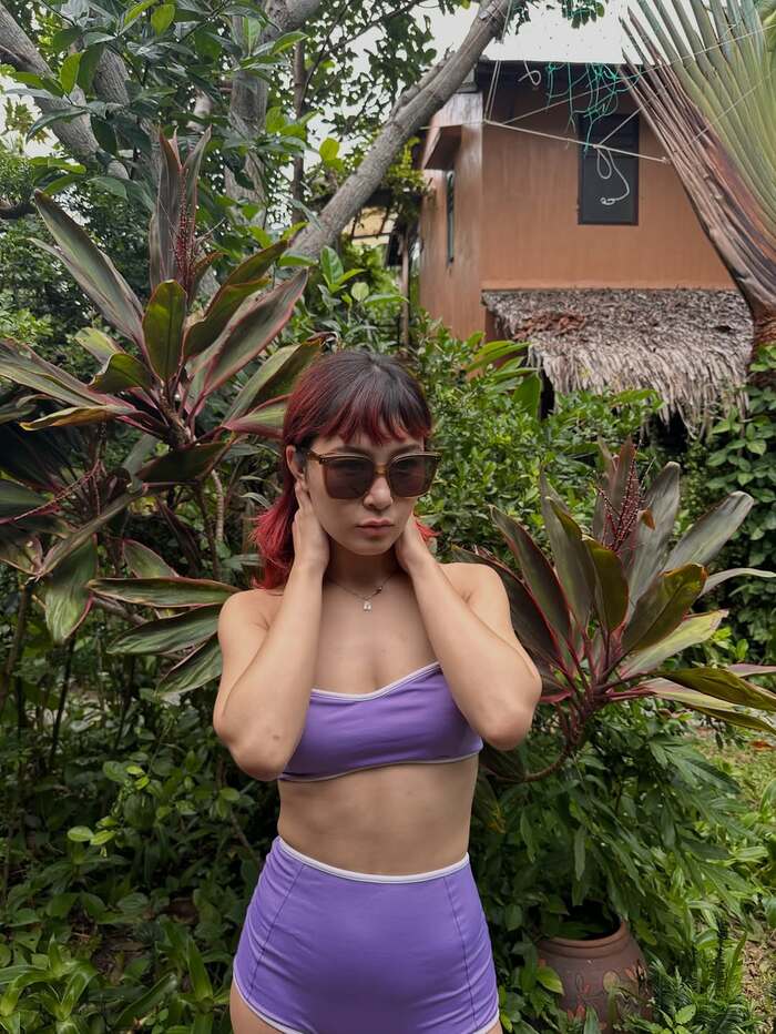 パープルの水着を着て、首元に手を当ててクールにポージングしたショットも披露!