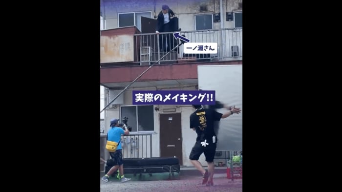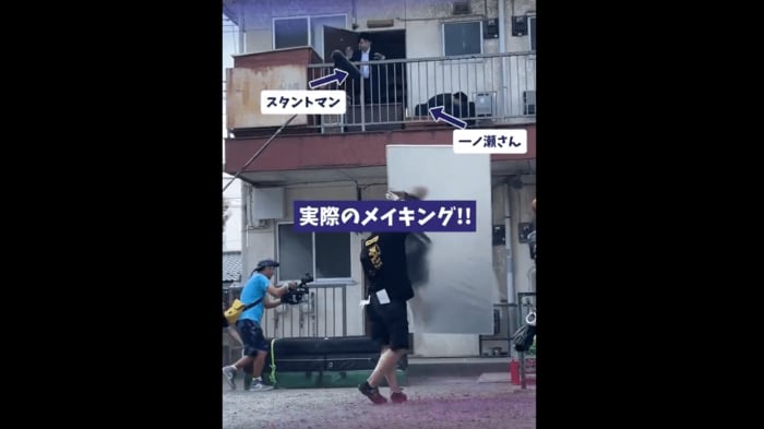 この飛び降りるシーン、「実は、飛び降りていたのは、スタントアクターの伊藤茂騎さんでした!」という文章とともに投稿された動画には、見事な連携で撮影に臨む一ノ瀬さんと伊藤さんの姿が捉えられています。