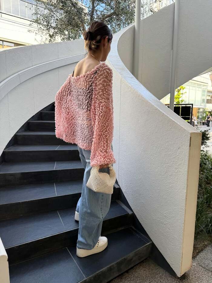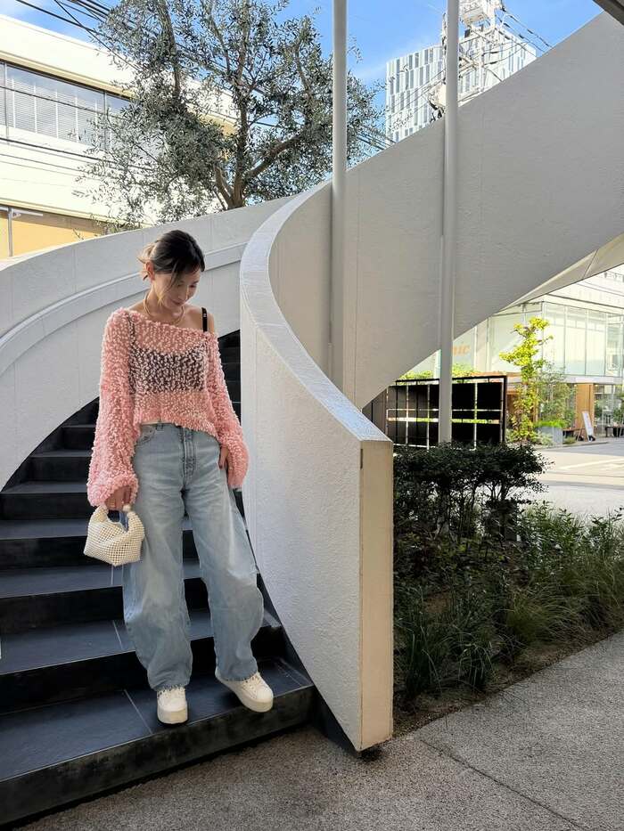 デニムに透け感のあるトップスを“ワンショル”スタイルで着こなしていて、大人カジュアルなコーデに仕上がっています。
