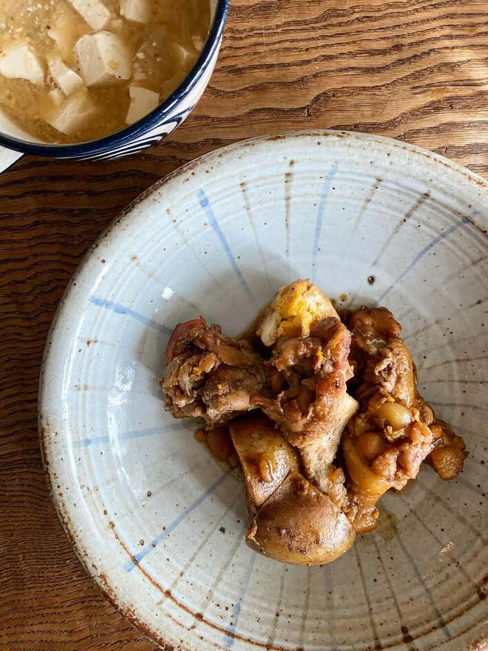 オシャレなお皿に盛られた手羽元とじゃがいもの照りがなんとも食欲をそそります!これは見ているだけでお腹が空いてきてしまいますね。また、朝食ということもあってか、豆腐の味噌汁も添えられています。